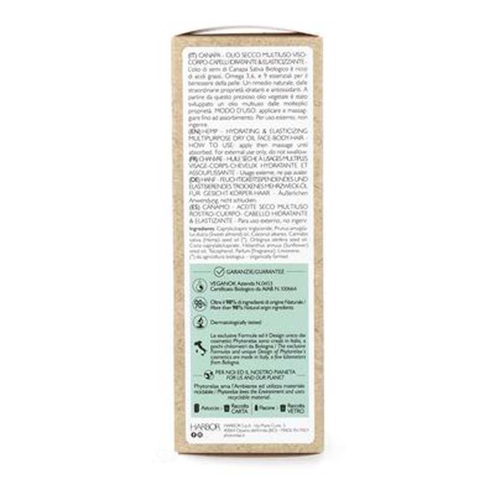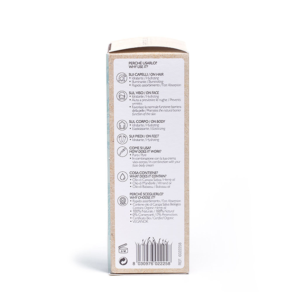 caprylic/capric triglyceride, prunus amygdalus dulcis (sweet almond) oil, coconut alkanes, cannbis sativa (hemp) seed oil (*), orbignya oleifera seed oil, coco-caprylate/caprate, herlinthus annuus (sunflower) seed oil, tocopherol, parfum (fragrance), limonene.