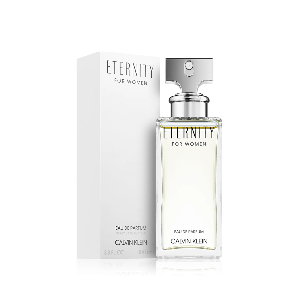 ETERNITY è stata ispirata da due grandi e belle storie d'amore: per celebrare il suo matrimonio, Calvin Klein offre a sua moglie la fede che il duca di Windsor aveva lui stesso offerto alla donna per la quale abdicò. All'interno di questa fede di brillanti è incisa la parola ETERNITY, "per l'eternità".