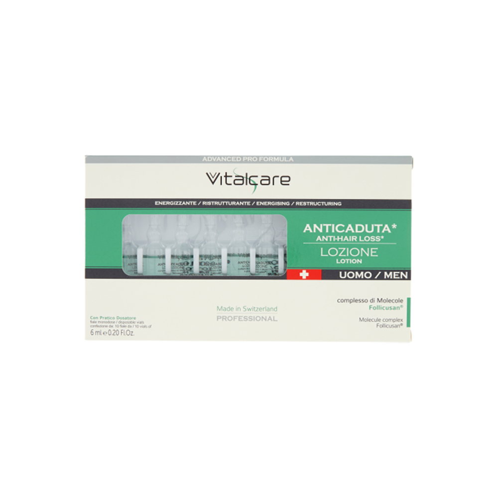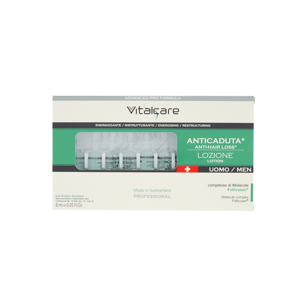 Le Fiale Anticaduta Uomo* Vitalcare aiutano a contrastare la caduta dei capelli grazie ad un complesso di principi attivi e sostanze vegetali naturali, la cui azione sinergica ripristina le condizioni ottimali per una crescita vigorosa e sana del capello. La sua formula innovativa si basa sulle proprietà rivitalizzanti e stimolanti del Complesso di Molecole Follicusan, concentrato di sostanze biologiche e di proteine che stimolano le funzioni di ricrescita del capello; sull'azione stimolante la microcircolazione dell'Eucaliptolo.