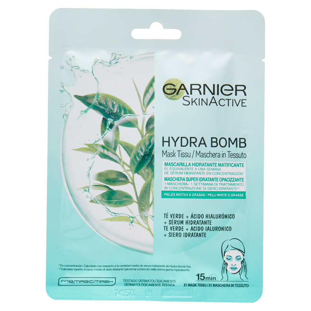 Questa maschera in tessuto agisce come una ‹‹bomba›› d'idratazione. Vera e propria innovazione, il suo tessuto è imbevuto di un trattamento super idratante ri-equilibrante, arricchito in estratto di tè verde, acido ialuronico e siero idratante. Una volta applicata sul viso, agisce come un impacco idratante che diffonde tutta l'efficacia del trattamento negli strati superficiali dell'epidermide.
