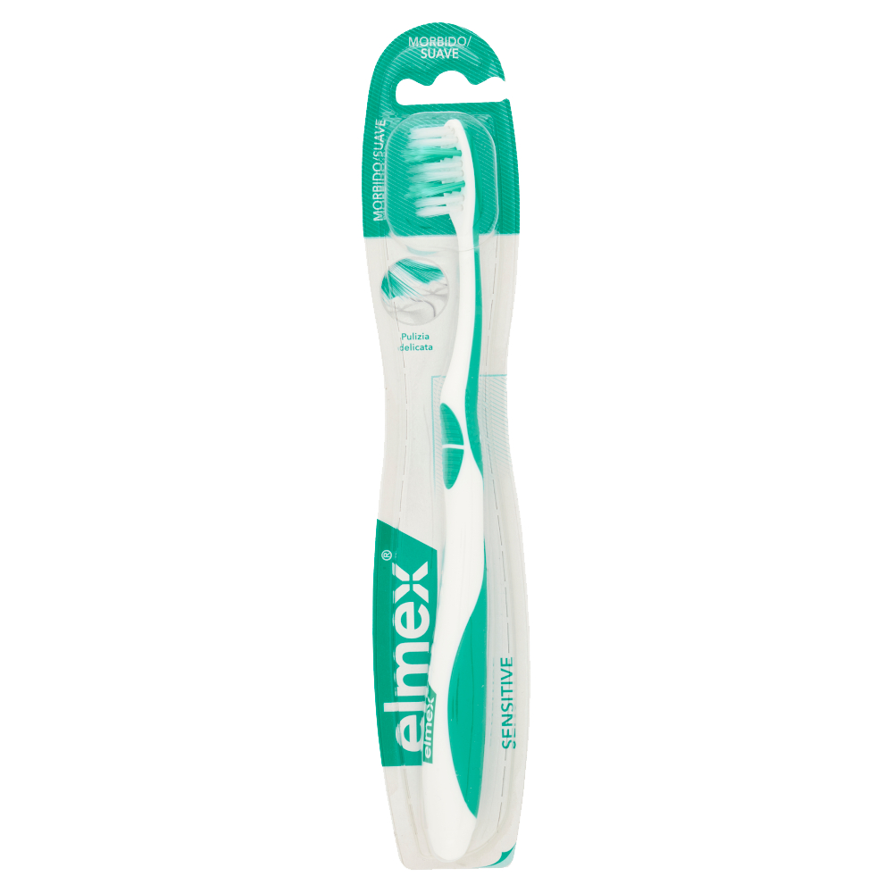Prenditi cura dei tuoi denti sensibili con lo spazzolino elmex Sensitive. Questo spazzolino per denti sensibili ha setole morbide che puliscono a fondo e delicatamente i colletti dentali esposti ed i denti. Lo spazzolino elmex Sensitive ha setole a forma di X che si estendono oltre le altre setole per aiutarti a raggiungere lo spazio tra i denti per una pulizia efficace. E con una morbida testina rivestita e un manico ergonomico, questo spazzolino è comodo da maneggiare e da usare. Ora puoi prenderti cura dei tuoi denti sensibili e avere ancora più motivi per sorridere con lo spazzolino elmex Sensitive.
