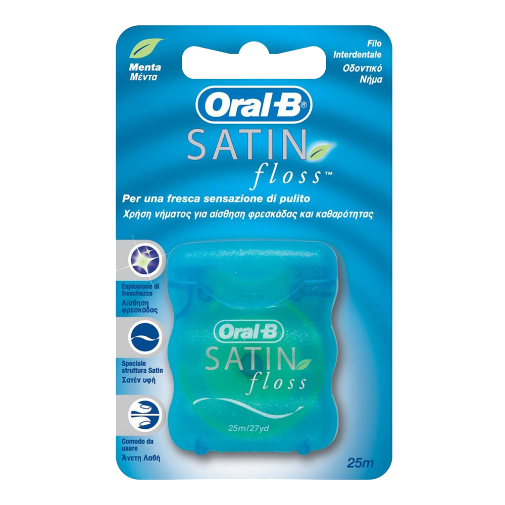 Il filo interdentale Oral-B Satin Floss è diverso da tutti gli altri, perché a contatto con i denti sprigiona un'esplosione di freschezza al sapore di menta, che ne conferma l'efficacia.