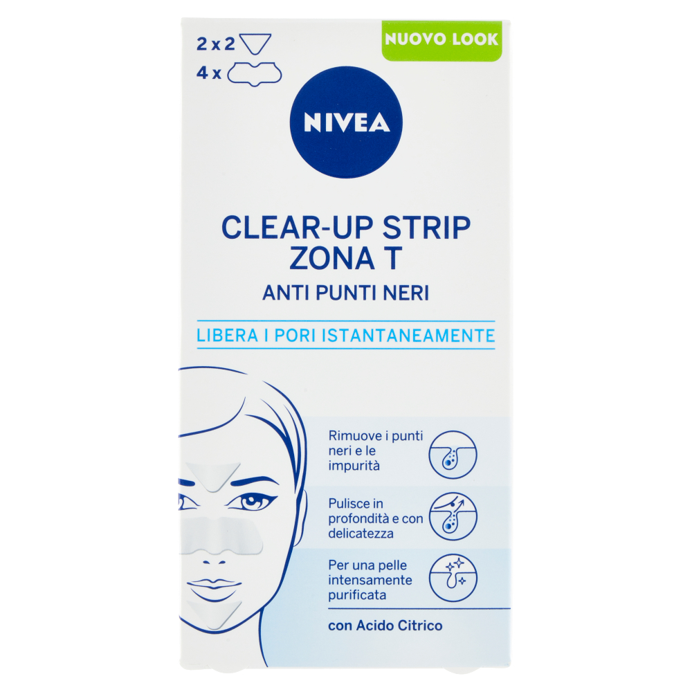 La Zona T (fronte-naso-mento) spesso è ostruita dalle impurità, dal sebo, dal trucco o dai punti neri. Per una pelle perfetta, i pori devono essere puliti a fondo. Clear-Up Strip Zona T è stato specificamente studiato per una pulizia a fondo di questa area del viso. NIVEA Clear-Up Strip Zona T rimuove efficacemente punti neri ed impurità: i risultati sono visibili immediatamente, la Zona T è pulita in profondità e la pelle è più luminosa.