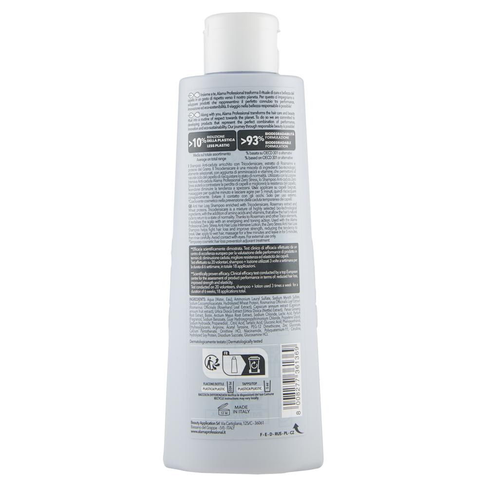 Shampoo Anti-caduta arricchito con Tricodensicare, estratto di Rosmarino e proteine del Grano. Il Tricodensicare è una miscela di ingredienti bio-tecnologici altamente selezionati, con aggiunta di amminoacidi e vitamine, che permettono al naturale ciclo del capello di riacquistare lo stato di normalità. Utilizzato con la Lozione Intensiva Anti-caduta Alama Professional Zero Stress, lo Shampoo Anti-caduta Zero Stress aiuterà a contrastare la perdita di capelli e migliorerà la resistenza del capello, facendone diminuire la tendenza a spezzarsi.