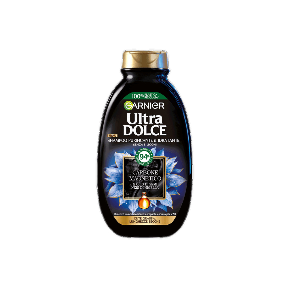 Scopri il Shampoo Garnier Ultra Dolce con Carbone Purificante ed Olio di semi neri di Nigella Idratante. Il nostro shampoo senza siliconi è il primo di Ultra Dolce con formula al 94% di origine naturale per rimuovere il sebo in eccesso dal cuoio capelluto e offrire idratazione alle lunghezze fino a 72 ore*. Sviluppato per purificare ed idratare i capelli, si risciacqua con facilità senza lasciare residui. Efficace senza compromessi, il nuovo shampoo Ultra Dolce Carbone Magnetico purifica la cute ed idrata le lunghezze. Senza siliconi, coloranti artificiali ed ingredienti o derivati di origine animale.