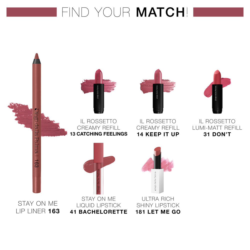 Definire il contorno partendo dal centro delle labbra (arco di cupido) e spingersi verso gli angoli, creando una pressione via via sempre minore per evitare di rilasciare eccessivo prodotto nel tratto finale. La sua texture, particolarmente scorrevole e cremosa, consente di poterla applicare non solo per tracciare e ridisegnare il contorno labiale ma anche per riempire e colorare l'intera area delle labbra per un risultato dalla tenuta estrema.