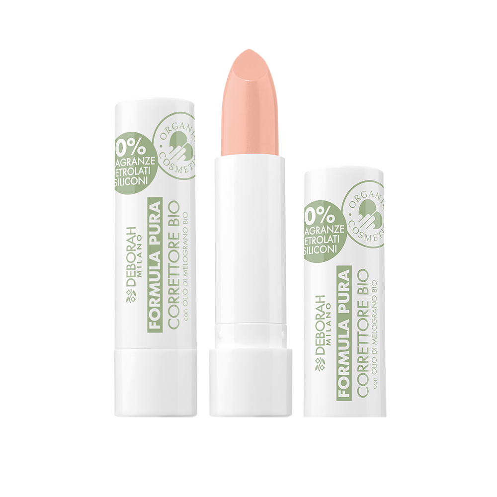 Correttore stick bio con copertura modulabile, arricchito con ingredienti naturali e olio di melograno biologico per un'azione antiossidante e idratante.