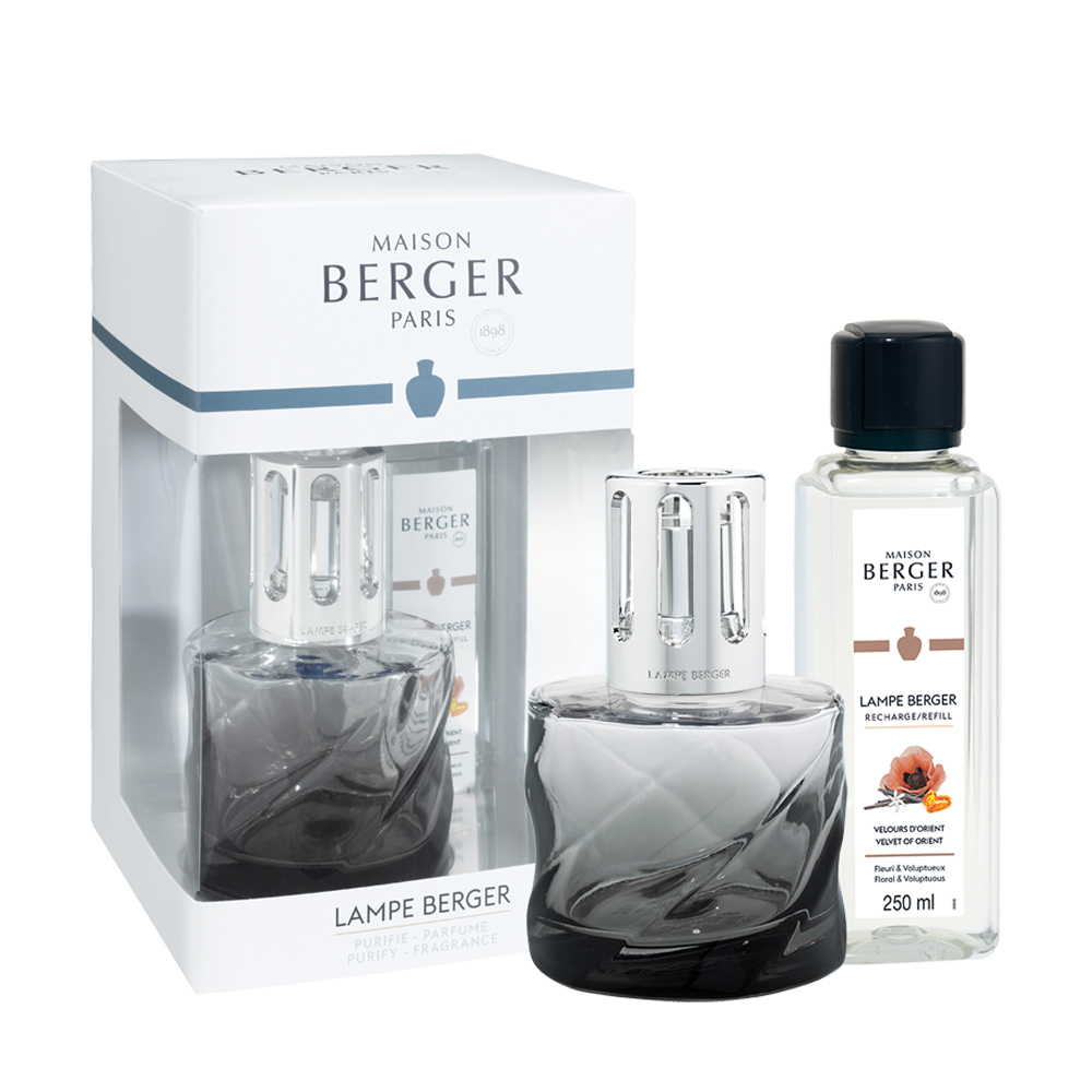 Confezione regalo in cartoncino griffata Lampe Berger completata daun flacone da 250ml di Velours d'Orient
