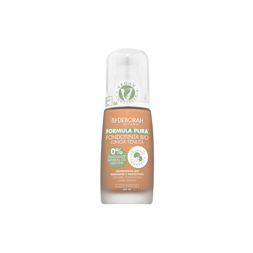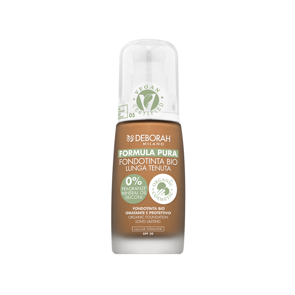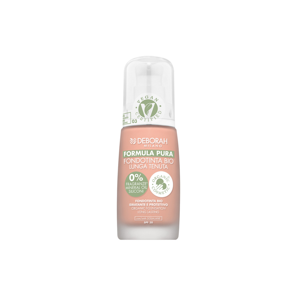 Il Fondotinta Formula Pura di Deborah Milano è formulato con una combinazione di attivi e ingredienti di origine naturale dalle proprietà idratanti e antiossidanti. La texture soffice e vellutata si applica facilmente, offrendo una coprenza modulabile che si fonde perfettamente con la pelle senza creare l'antiestetico effetto maschera. La formula, studiata per una tenuta e un comfort estremo, include un filtro anti-inquinamento che protegge la pelle dalle aggressioni esterne, mantenendola levigata, morbida e idratata a lungo. Le polveri ad azione soft focus riducono visibilmente l’aspetto dei pori e opacizzano le zone oleose del viso, minimizzando le imperfezioni cutanee. Formulato senza parabeni, siliconi, petrolati, acrilati e fragranze, è adatto anche alle pelli più sensibili. Non comedogenico. Ipoallergenico. SPF 15. Disponibile in diverse tonalità per adattarsi a vari incarnati.