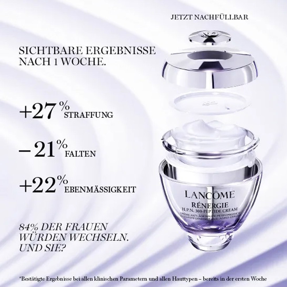 La crema da giorno antirughe Lancôme Rénergie H.P.N. 300-Peptide Cream si ispira a ricerche avanzate nel campo della scienza rigenerativa. Contiene una combinazione brevettata di acido ialuronico, niacinamide e oltre 300 tipi di peptidi. Indipendentemente dall’età, accelera la rigenerazione delle cellule cutanee e rassoda la pelle in una sola settimana. Rassoda i contorni del viso, riduce la visibilità delle rughe e attenua le macchie scure.