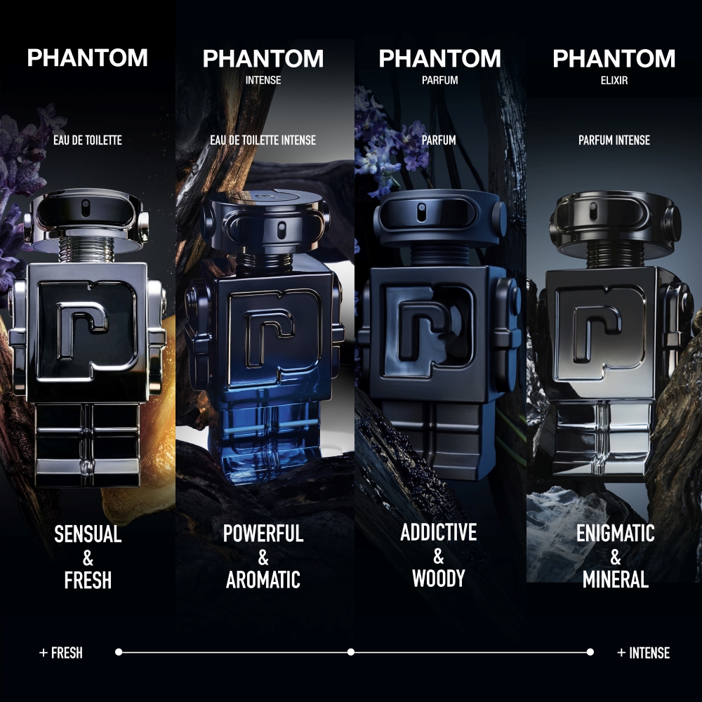 PHANTOM Elixir è la fragranza che cattura la vibrante energia di una notte di festa, concepita per l’uomo “rock and roll” che vive secondo le proprie regole in un affascinante gioco di luci e ombre.