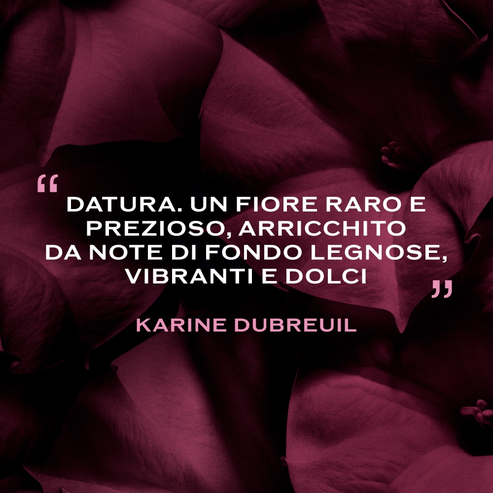 La fragranza si apre con una nota fresca e frizzante, in cui la vivacità del pompelmo si miscela all’incantevole esotismo dell’ylang-ylang. Dal cuore della fragranza emergono i sentori dell’enigmatico fiore di Datura, che sboccia solo al calar della notte. Infine, un caldo e avvolgente accordo legnoso si svela grazie al legno di guaiaco e all’olio essenziale di sandalo, creando una fragranza tanto preziosa quanto intensa.
