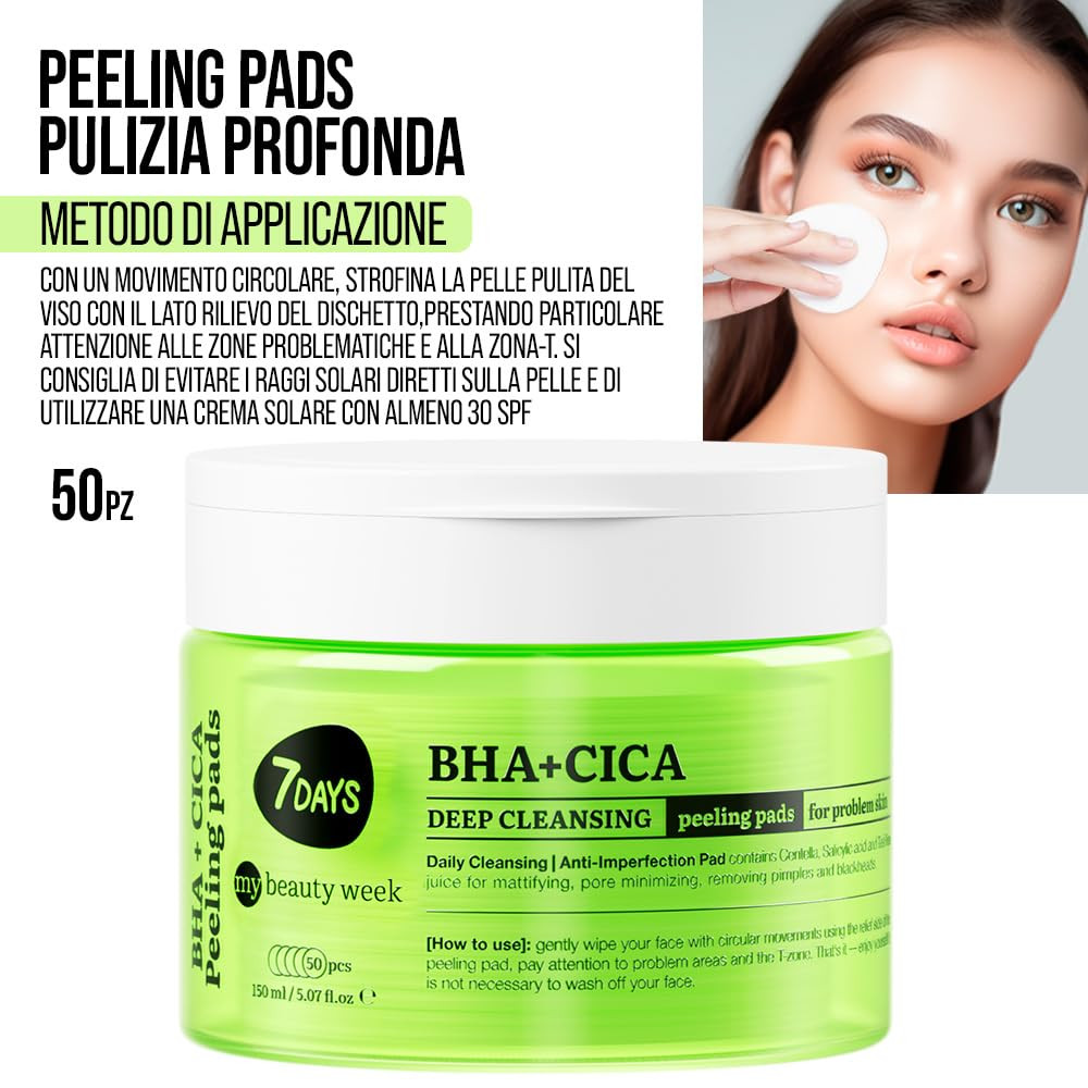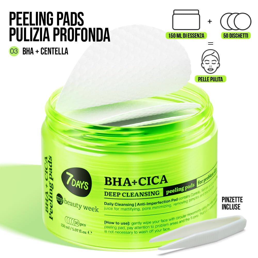Dischetti esfolianti viso monouso con BHA (acido salicilico) e CICA (Centella asiatica + Tea Tree), ideali per pelle problematica e sensibile.