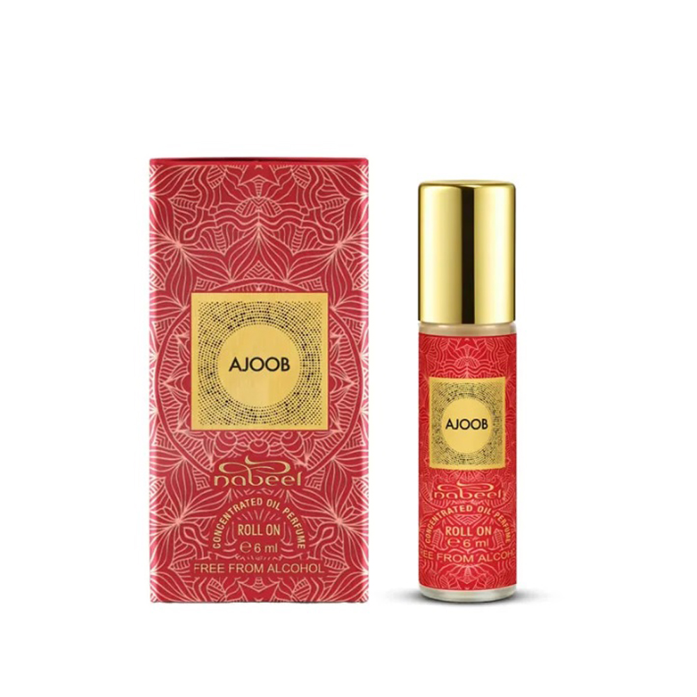Ajoob è un profumo avvolgente e intrigante. Si apre con invitanti note di fragola, pera e ananas che incontrano un cuore di rosa, mughetto, pesca e fresia, per poi fondersi con un’elegante base di muschio, legno di sandalo, caramello e legno d’ambra.