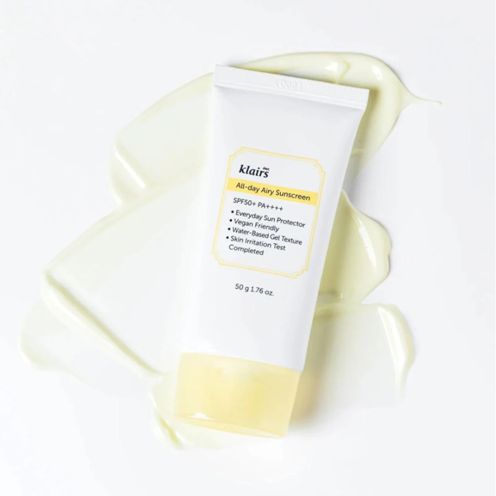 Klairs All-Day Airy Sunscreen SPF50+ protegge la pelle dai raggi UVA e UVB. Texture leggera, senza profumo e non appiccicosa, ideale per pelli sensibili . Ottima come base idratante per il trucco.