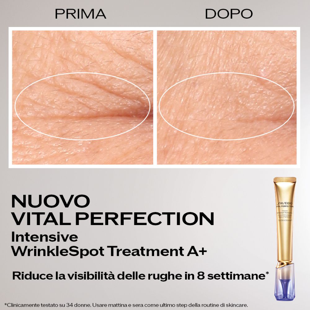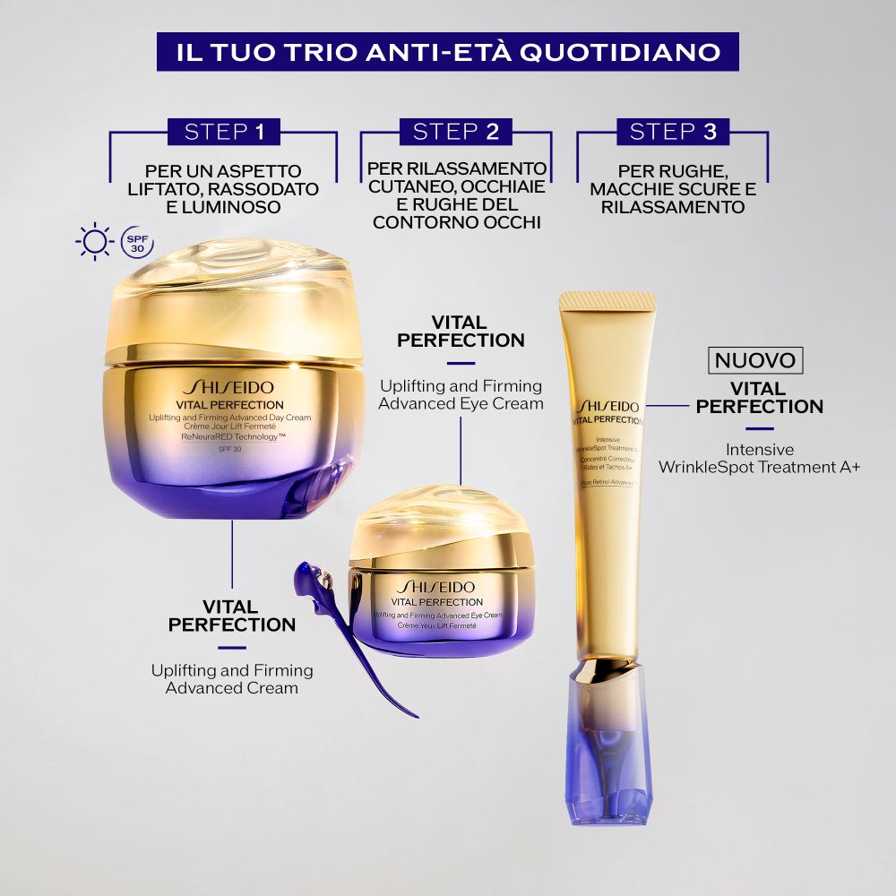 Appartenente alla linea Vital Perfection, questo trattamento mirato incarna l’eccellenza scientifica di Shiseido per una pelle che appare visibilmente più liftata, rassodata e luminosa.